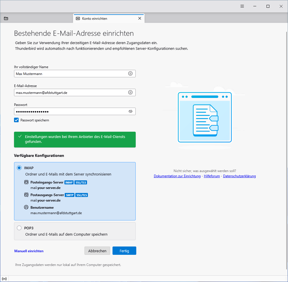 Auch die meisten anderen E-Mail-Programme für PC und Smartphone sollten die Server-Einstellungen nach Eingabe der E-Mail-Adresse automatisch ermitteln können. Falls nicht, tragen Sie die folgenden Einstellungen manuell ein: